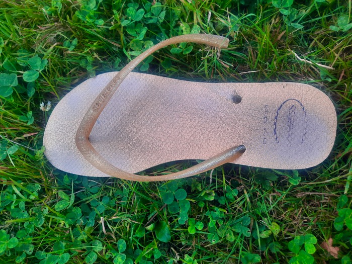 Here we go......another broken flip flop. I keep the whole ones with my Burning Man stuff. So this whole one is going into a bag with all the other whole ones from a broken pair, to be worn at Burning Man.